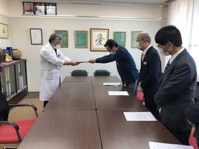 独立行政法人国立病院機構沖縄病院の川畑勉院長へ手交 中部地区医師会副会長 松嶋顕介からも同様の内容を手交