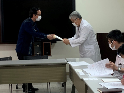沖縄県立中部病院の玉城和光院長へ手交 中部地区医師会会長 中田安彦からも同様の内容を手交